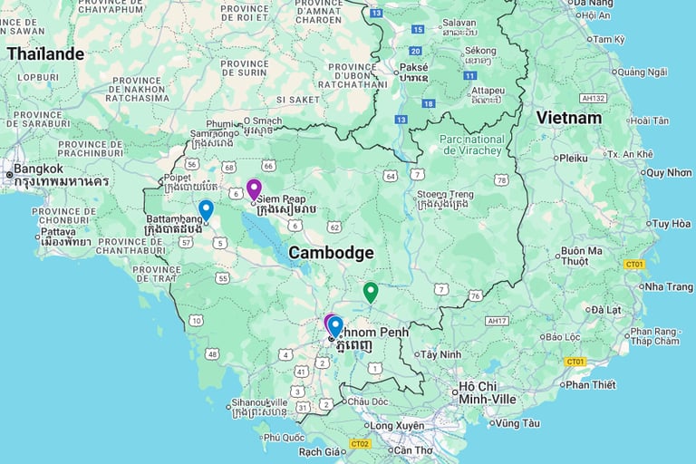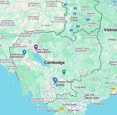 ESC intervient depuis 2001 et deux fois par an dans 5 écoles (visibles sur la carte ci-dessous) : Battambang (Baat Dambang), Siem Reap, Kampong Cham, Phnom Penh (Thmey) et Phnom Penh (Chbar Ampeu)